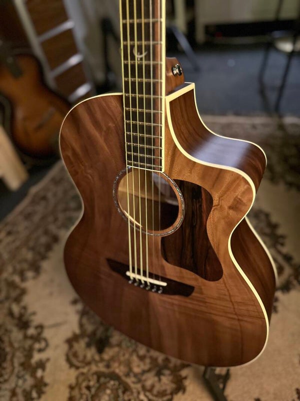 The cutaway body is constructed from all-solid figured Indonesian Trembesi. Featuring an exclusive satin finish over a rich the guitar's eye-catching figuring is allowed to come through - its looks certainly complement its smooth and balanced tonal palette! The X-Brace design and quarter sawn spruce bracing yields rigidity whilst giving the guitar superior resonance. Other body appointments include ABS body binding; black with white purfling, and a figured Macassan Ebony pickguard.