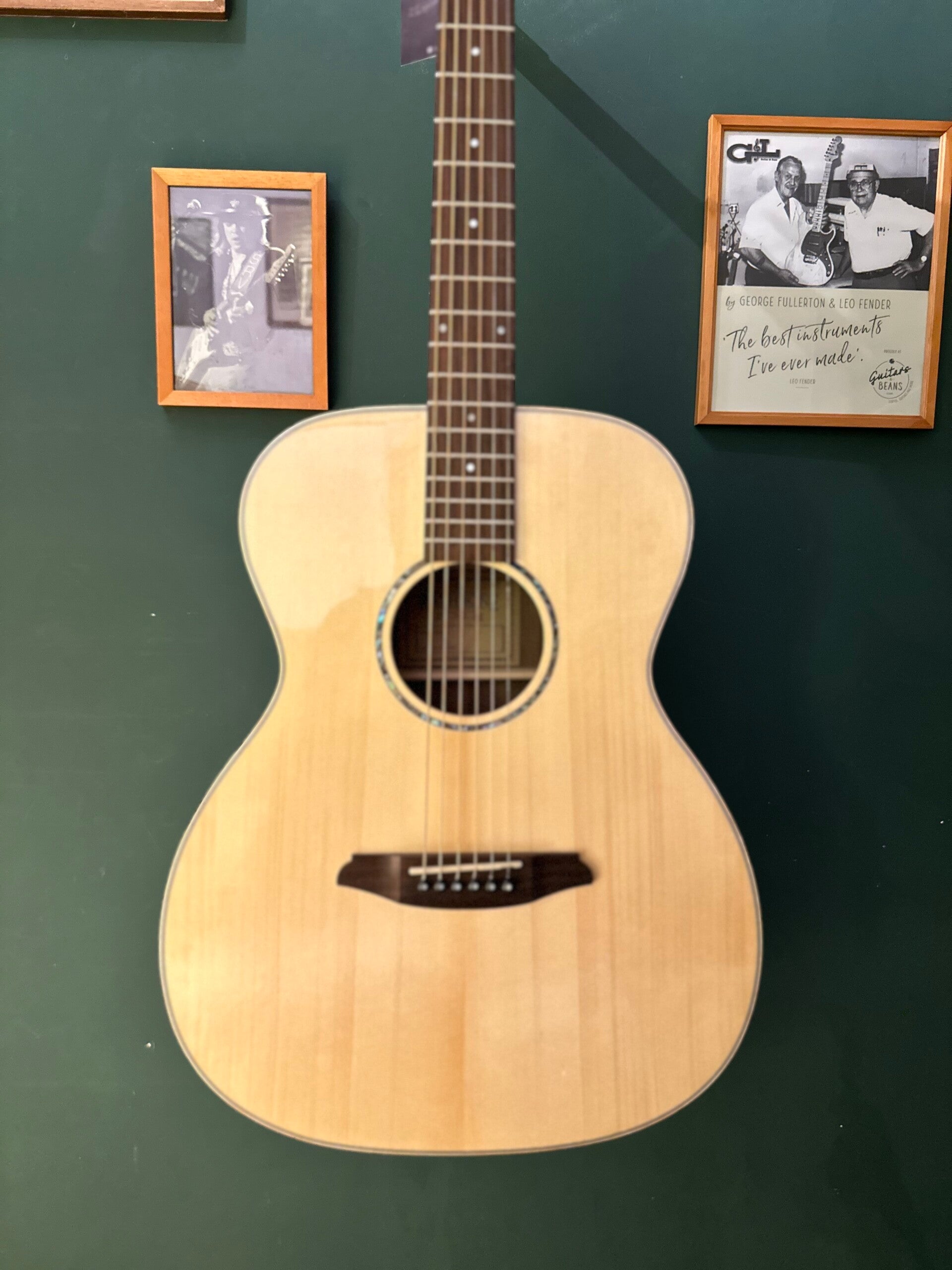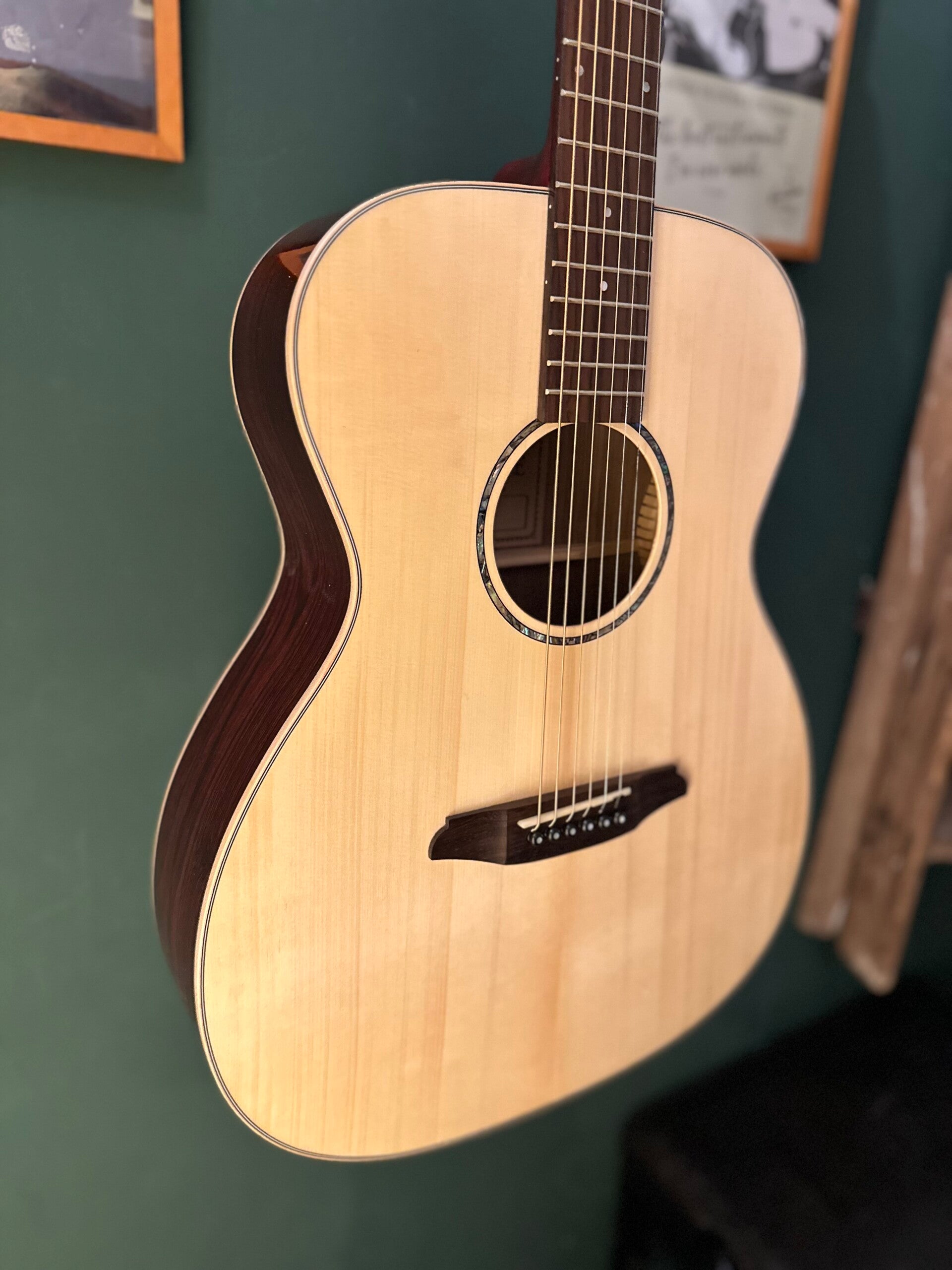 A real powerhouse, this R2SB Orchestra Model uses a Solid Spruce top for tonal clarity, and highly-figured Becote for the back and sides. The beautiful Becote wood responds similarly to maple with superb linear projection and clarity.