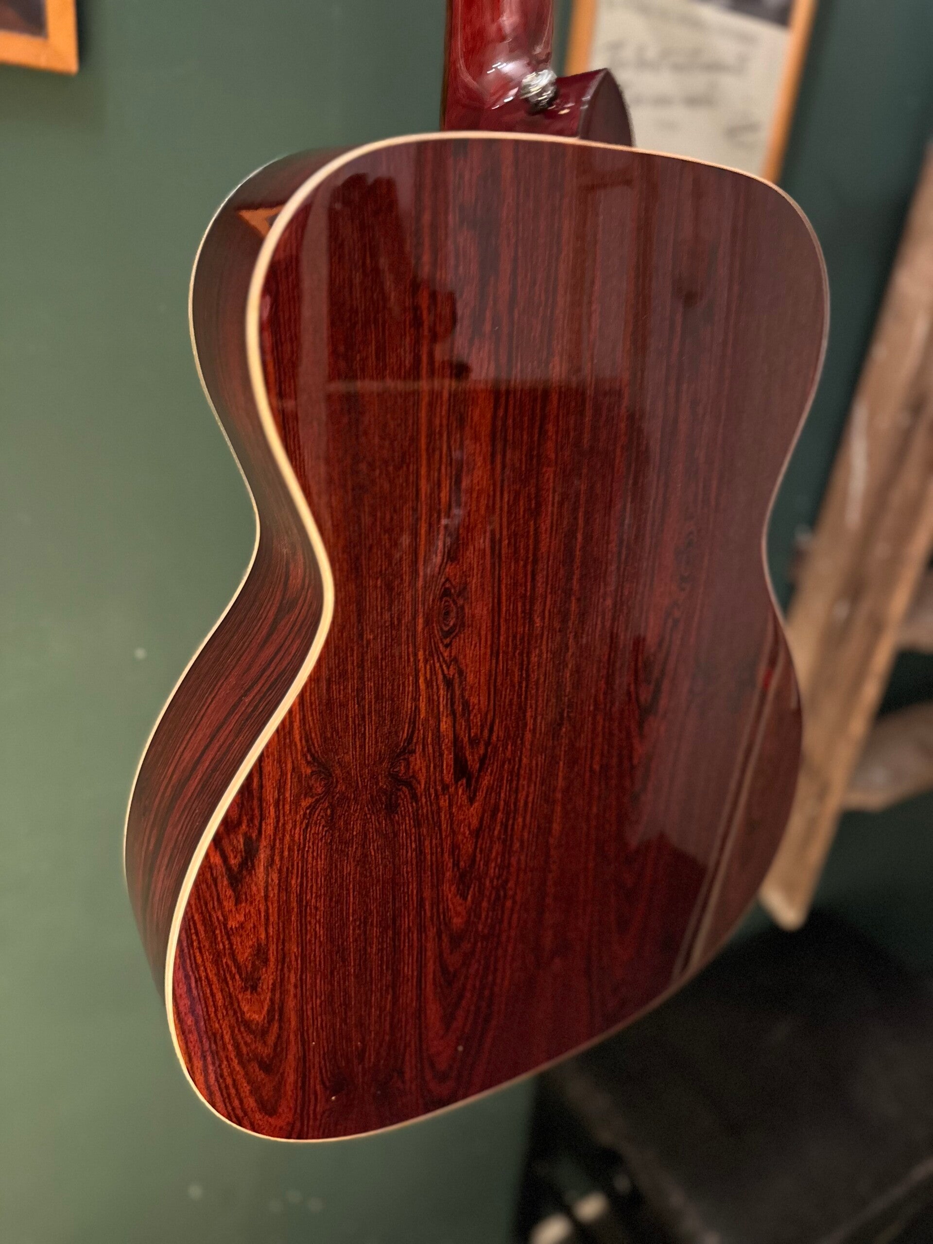Due to the environment in which it was initially designed to be used, the 'OM' was not a large-bodied guitar. In fact, few of the early 'modern' guitars would be considered large today. So, the 'OM-sized' Rathbone No.2 is not a large bodied guitar either, but the neck joins the body at the 14th fret, so the scale length is one that we would recognise from most modern guitars. When first used, this 'long' scale legnth was found to help deliver a remarkably, and some may say disproportionately, powerful and dynamic tone. The tuned strings are under greater tension than on shorter scale guitars, so they give a far greater tonal response and 'punch'.