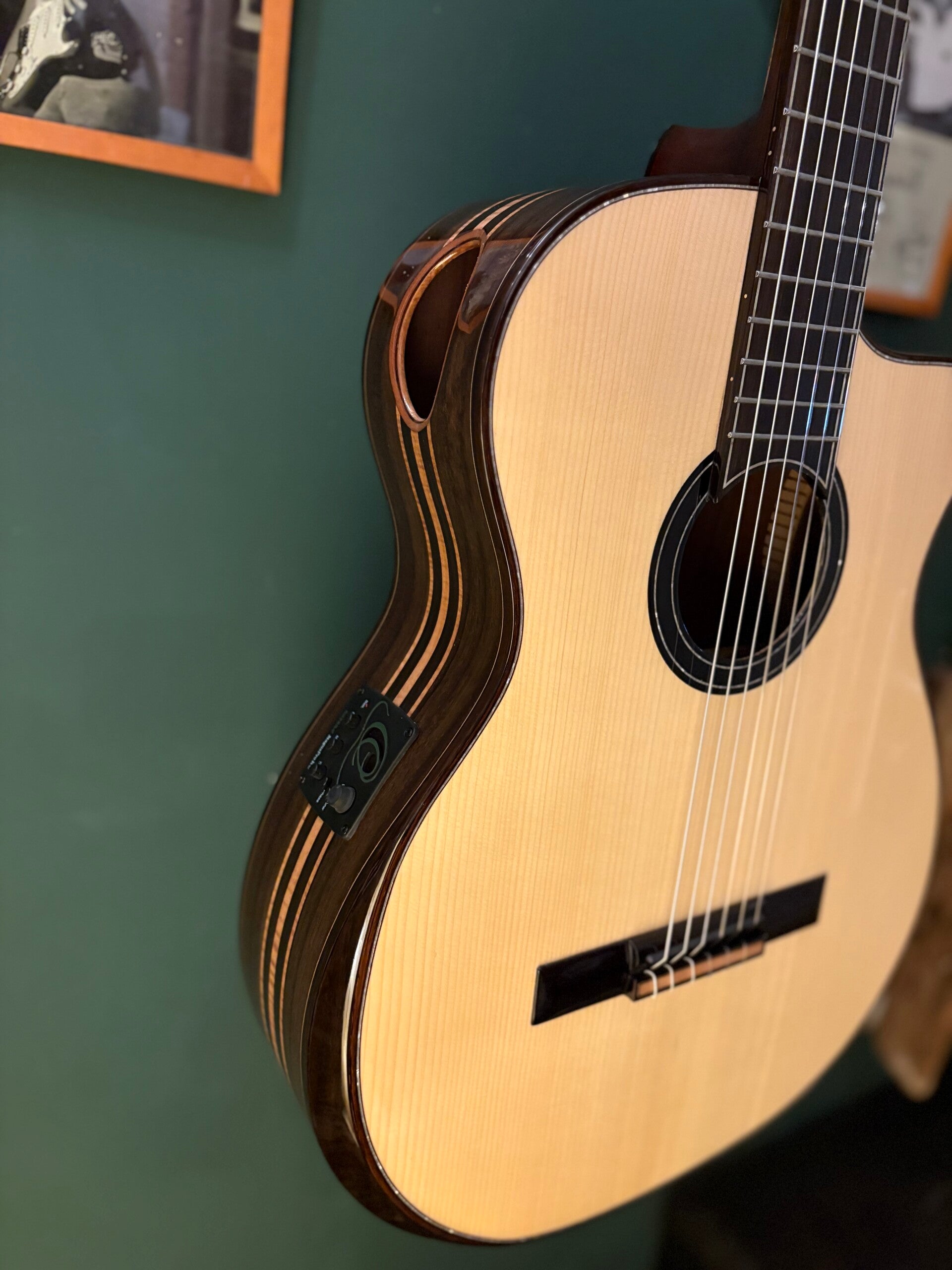 The guitars of the Private Room collection stretch the boundaries of nylon guitar production and beauty. Hand selected tonewoods are custom crafted into exclusive instruments with exotic finishes, custom appointments, and modern amenities including contoured armrests and professional grade electronics.