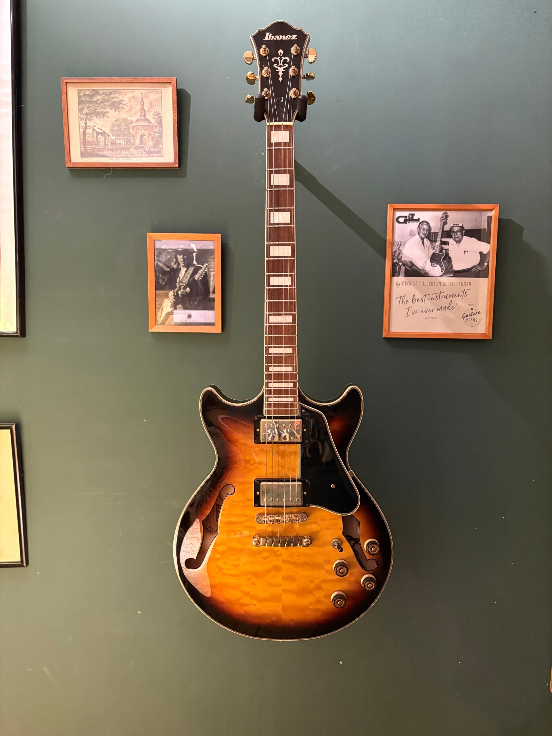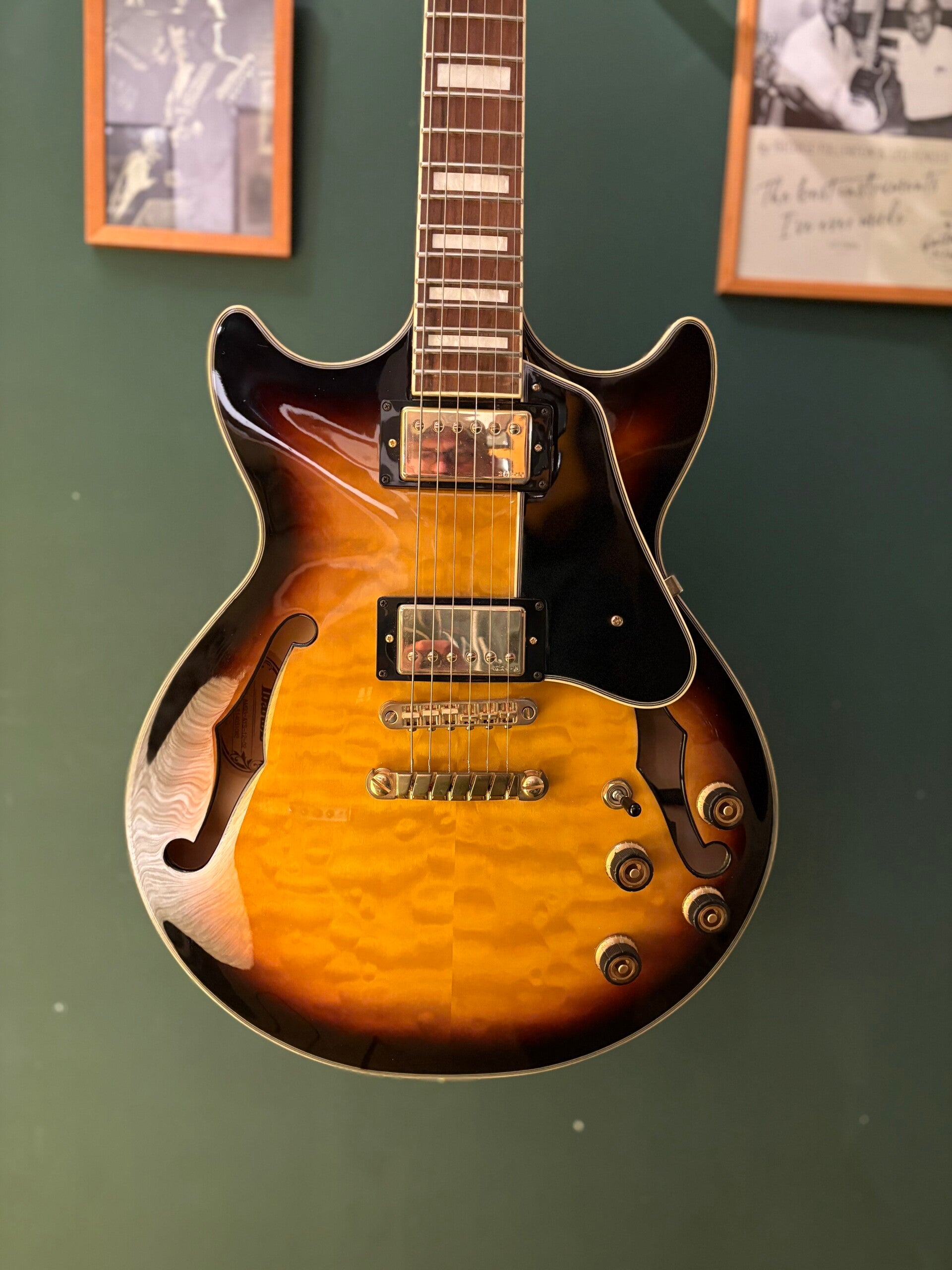 Hollow-body electric guitar with two “F” holes from Artcore series that was introduced in 2002 and is respected for its tone, sustain and the way it holds its tuning. This ‘Expressionist’ model is equipped with the Ibanez original, passive Super 58 pickups with Alnico magnets – the preferred pickups of George Benson, Pat Metheny and John Scofield on their own Ibanez signature models. These pickups are jazz favourites but perform well in a variety of situations, delivering the smooth, nuanced tones and the biting growl of blues. The instrument features thinner, 67mm deep body with top, back and sides made of quilted maple. The Expressionist 3-piece mahogany/maple set-in neck is fitted with a bound rosewood fingerboard with medium frets, 305mm radius and acrylic block inlays. Scale length is 628 mm, nut width is 43 mm. Other features include an ART-1 bridge with Quik Change III tailpiece for faster and easier string changing, black pickguard, gold hardware. Antique Yellow Sunburst colour design.