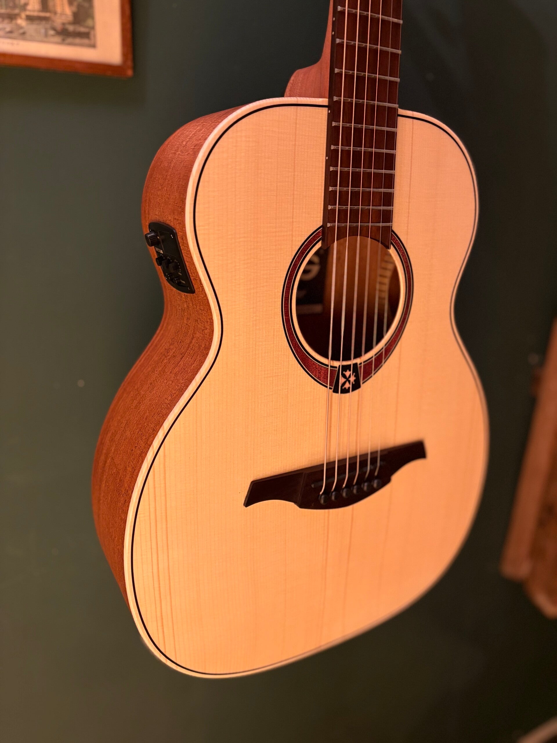 The compact body of the T70TE-NAT is crafted with a solid Spruce top and Mahogany back and sides, delivering a warm and resonant tone. The natural satin finish not only enhances its visual appeal but also allows the wood to vibrate freely for optimal sound quality.