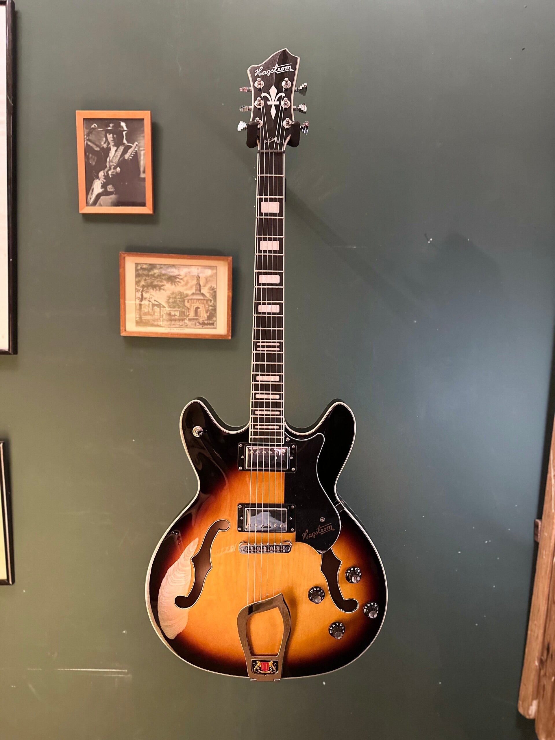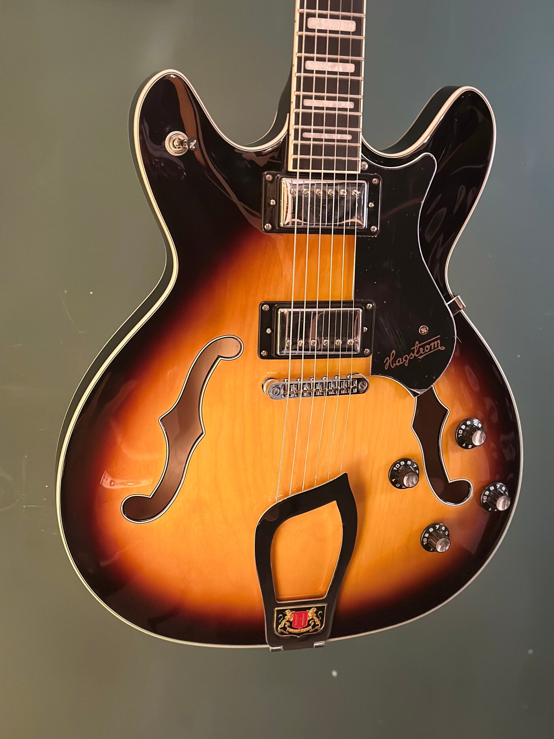 Enter a true Scandinavian warrior! The Viking® stands proudly next to its solid-body siblings, the Swede and Super Swede. It is THE undisputed all-time classic of the Hagstrom range, and is one of the finest and most affordable semi-hollow guitars on the market today. With its meticulously crafted laminated maple body, solid center-sustain-block, and hard-maple set neck, it churns out sounds as diverse as they come. Hagstrom’s prominent, yet not-too-hot HJ50 humbucking pickups deliver a broad sonic palette ranging from Blues to Rock to Jazz-Fusion to 60’s Beat and beyond. You can even take it on a shred spin.