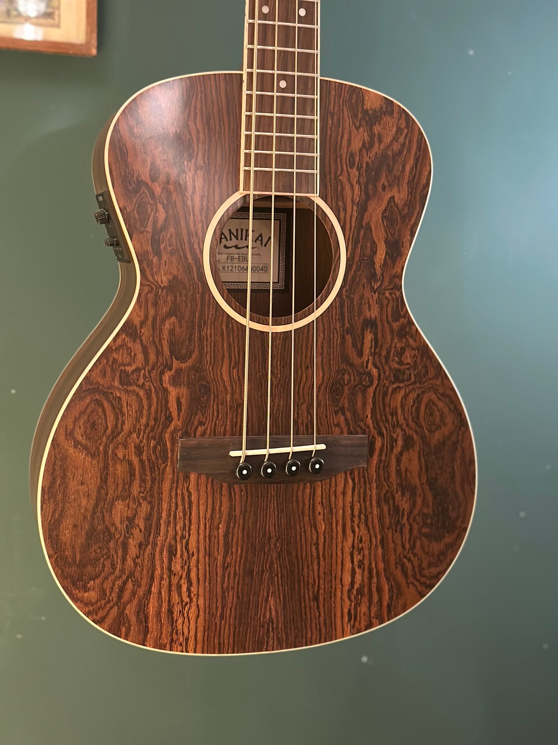 Great for stage or rehearsal, a Lanikai Figured Bocote Bass ukulele utilizes many features such as a truss rod for easy action adjustments, Fishman Clásica II pickup with tuner, a comfortable neck profile, select wood, smooth action Black open back tuners, NuBone XB® nut and saddle, D’Addario® strings, satin finish and a padded gig bag. Each Figured Bocote ukulele has unique graining that makes each instrument a work of art.
