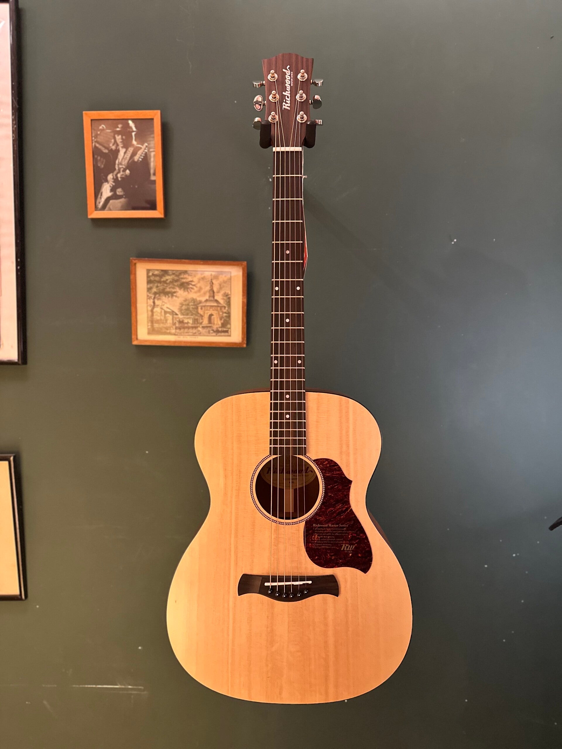 The technical and aesthetical advanced features include bone fittings, a double action trussrod, voluted headstock joint, cotton capped X-braces, mahogany back braces, high grade Derjung machine heads, USA D'Addario EXP16 coated phosphor bronze strings.